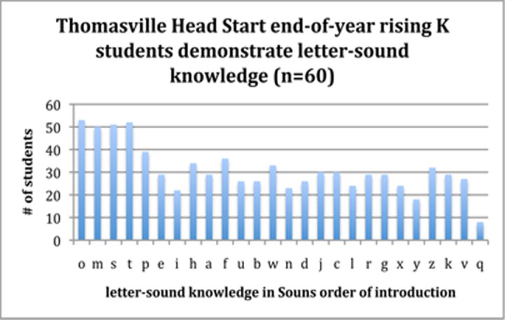 This center has an abundance of remarkable teachers working with their children. After this year’s success, we expect all the teachers will see the value of this simple program for their children. It is understandably difficult to accept a program that is counterintuitive. We have been so steeped in teaching letter-names first, that the idea of teaching letter-sounds first causes resistance. Thanks to those teachers who stepped outside the box in Thomasville, children will read. The results are quite clear. Consider the data at this year’s end, when those little four year olds who are going into their second year with this program are evaluated.