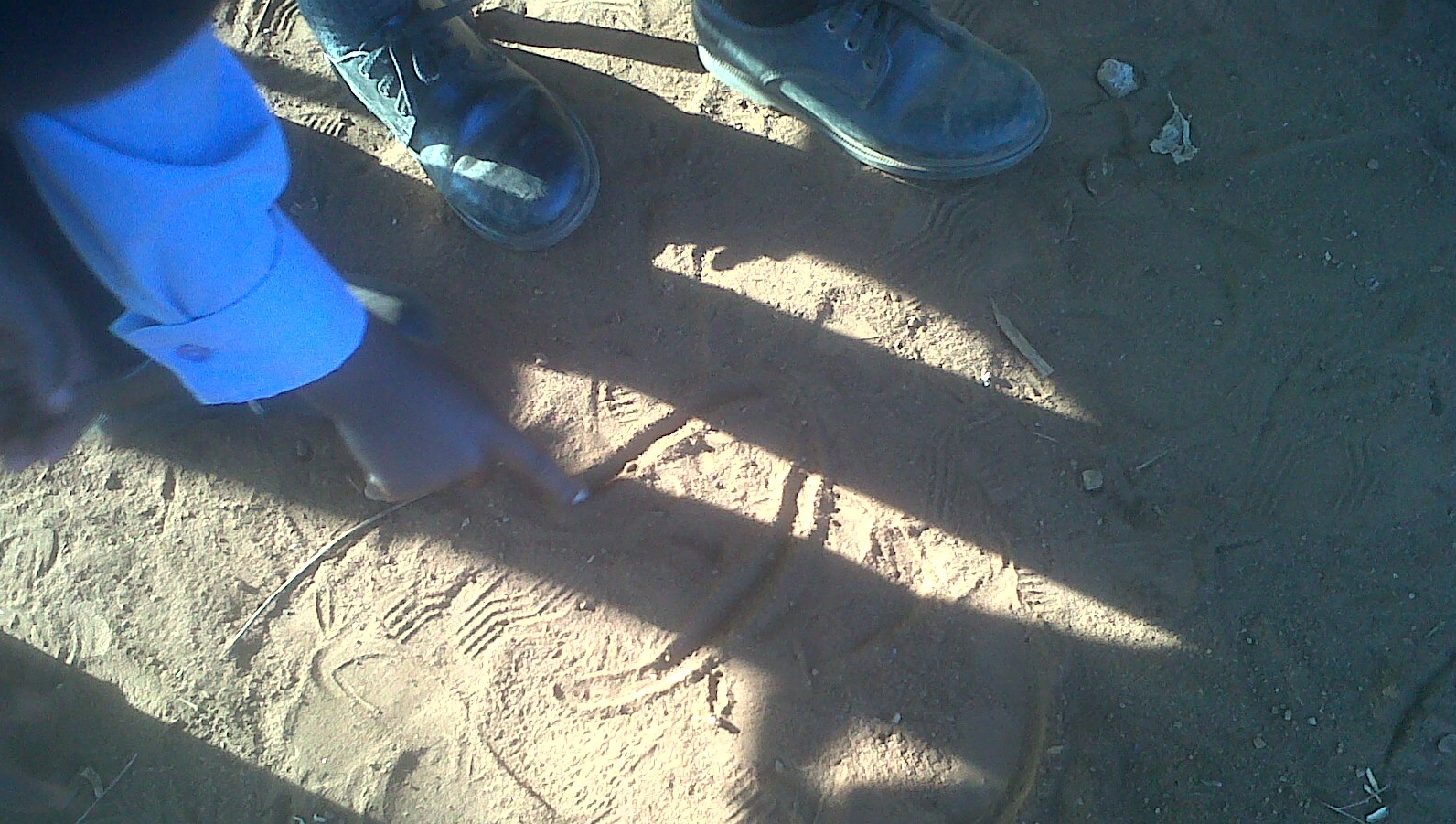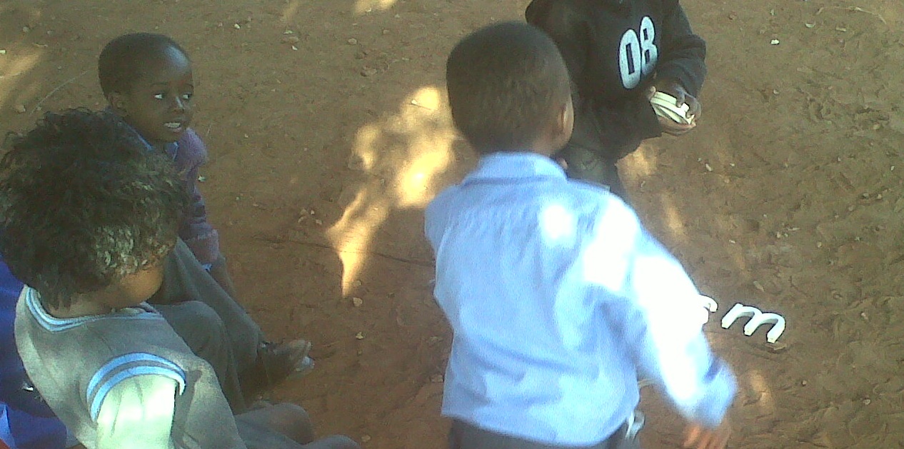 2.  They will go through the introduction process, as mentioned above, but instead of displaying a plastic representation of the sound, the teacher will slowly write the sound in the dirt in front of the learners.  Form the letter slowly, so the child is able to watch how the letter is formed.